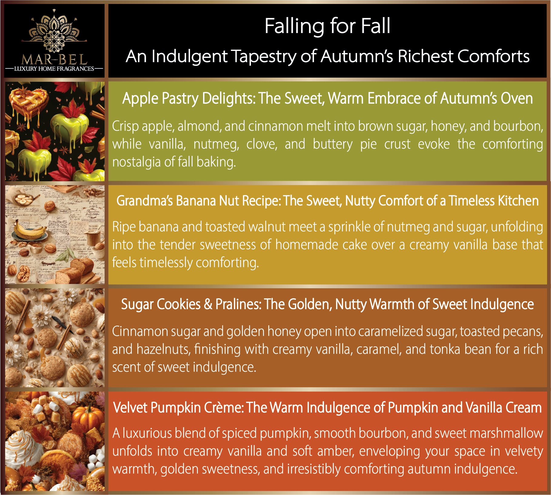Celebrate the golden season with fragrances that capture autumn’s most cherished moments — from the warmth of home-baked treats to the elegance of cashmere evenings, the sparkle of festive gatherings, and the rustic charm of the harvest outdoors. Falling for Fall brings together eight indulgent scents, each designed to wrap your space in the richness, comfort, and magic of autumn. Cozy desserts, spiced fruits, sparkling celebrations, and woodsy trails — every fragrance invites you to savor the season in its most luxurious form.